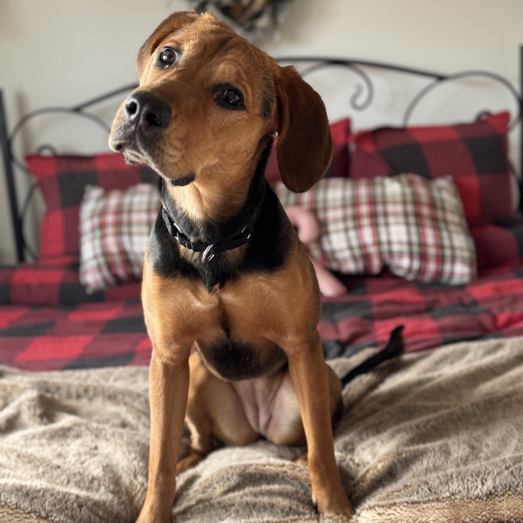 KNOWN HOUSEBREAKING &/OR CRATING: Darla is 99.9% housetrained! Sometimes when the outside is scary she opts to go to the bathroom...... in the bathroom!!! Her foster has found accidents RIGHT next to her son's toilet!! Darla is increadibly smart. She's fine in the crate overnight, but gets VERY nervous when left alllllll on her own. She would LOVE to share a home with another friendly pup to keep her company. We would recommend feeding in her crate (as she is a hound and does not like to share her food!)
