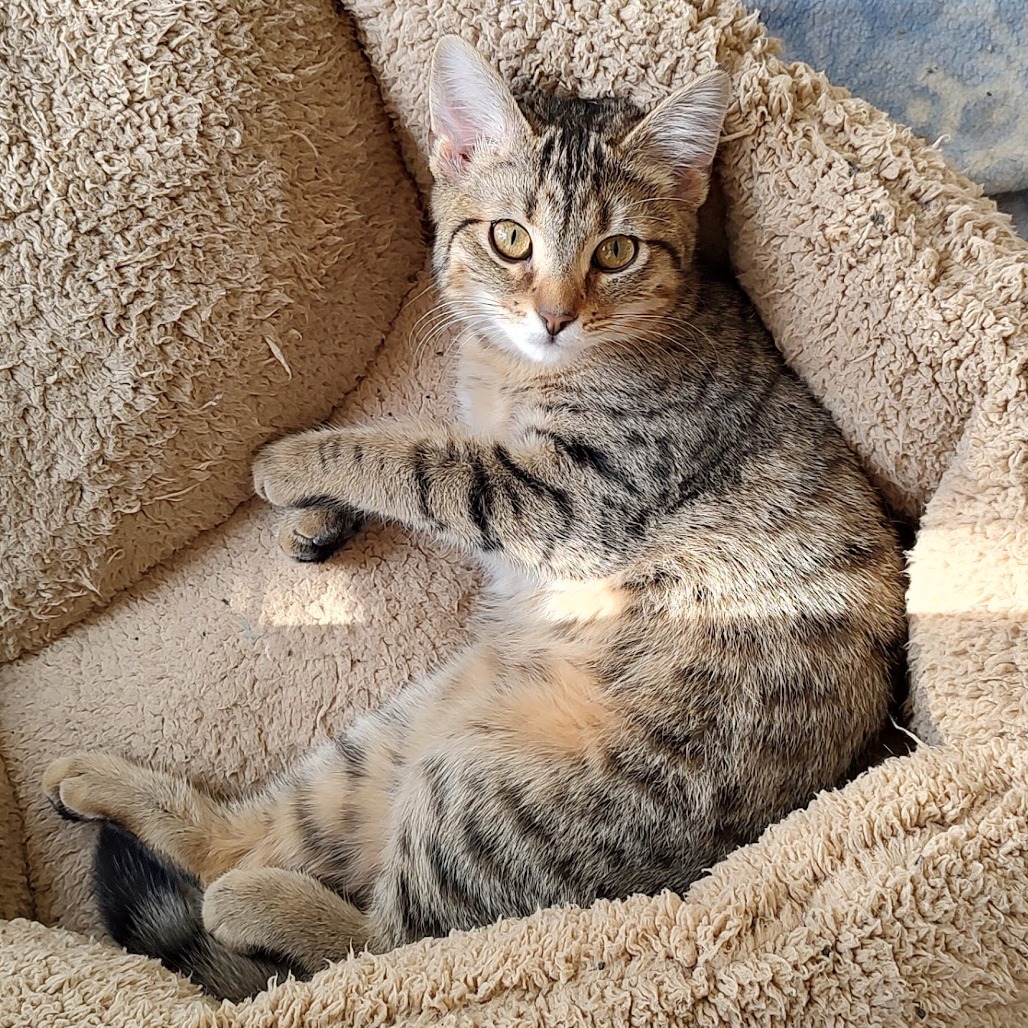 Mama is still young and very playful. She likes to get pet and loves back pets. She sleeps next to me but not on me. She loves to watch the world go by out the window, and also likes high perches where she can look down on everything that's happening.
