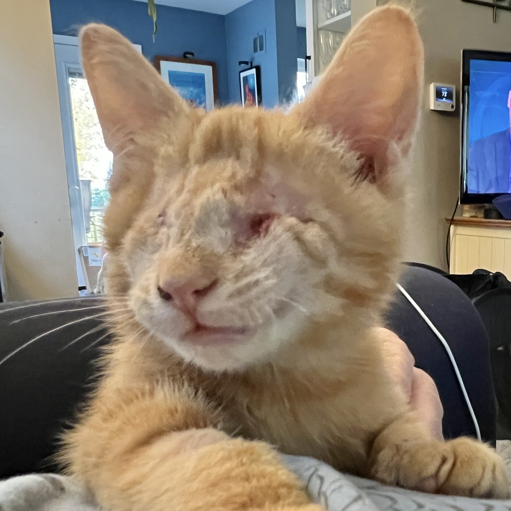 Violet is an outgoing, very cuddly kitten who loves her adoptive sister, Buttercup. Violet came to us with a horrible eye infection and has subsequently had both eyes removed. She has learned to live without her sight and does great! Buttercup helps her navigate the world.