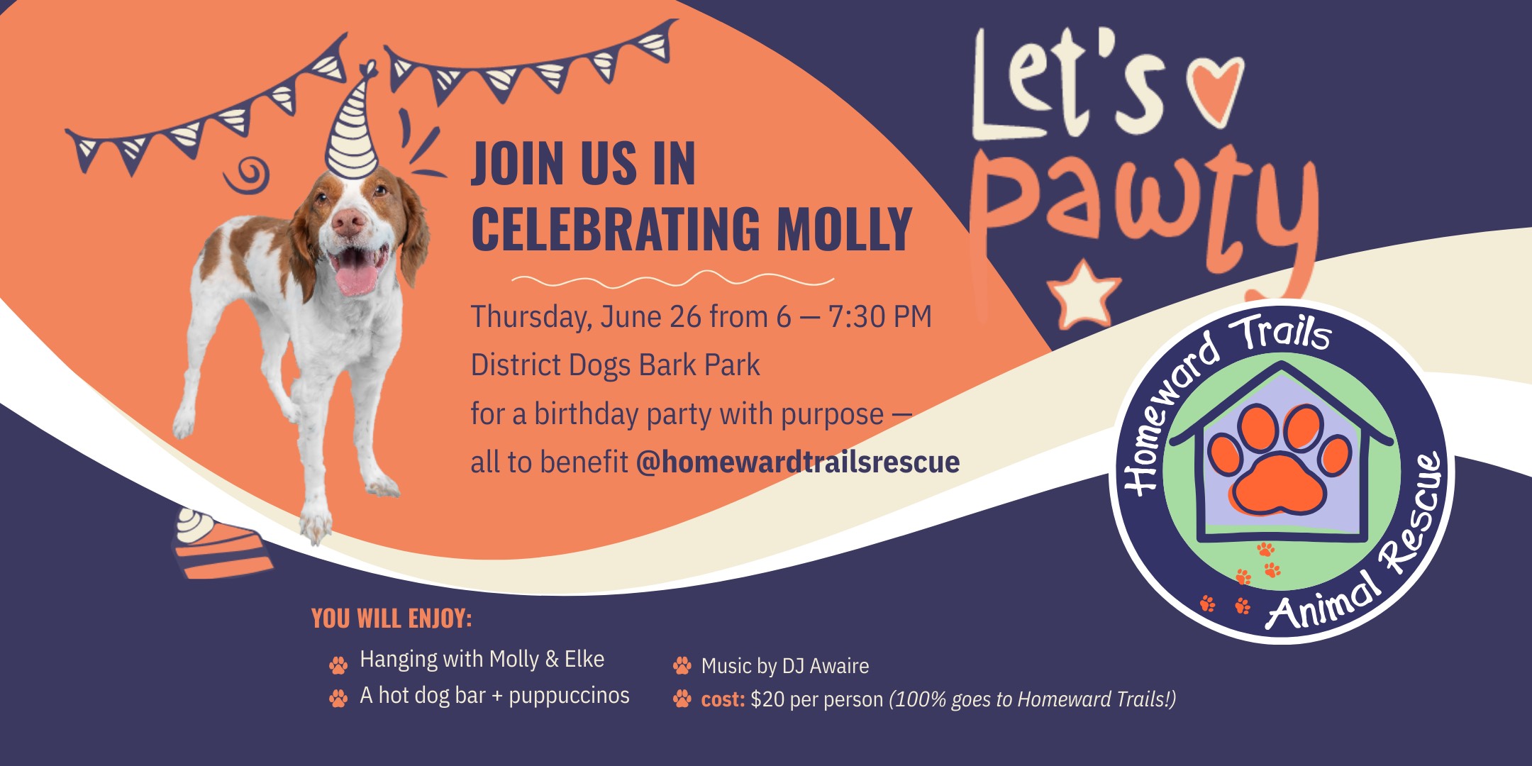 Homeward Trails is proud to partner with District Dogs for Molly’s 13th Birthday Bash! Join us Thursday, June 26th as we celebrate the incredible life and legacy of Molly, the dog who started it all. As the inspiration behind District Dogs, Molly is more than a mascot — she’s the original District Dog, the reason this community exists, and truly the Queen of DD. Now, as she turns 13, we’re throwing her a birthday bash to give back, benefiting Homeward Trails Animal Rescue, and you’re invited. This come-and-go style celebration is open to all — stop in anytime between 6:00pm and 7:30pm at The Bark Park by District Dogs, 3210 Georgia Avenue Northwest Washington, DC 20010 for an evening full of fun, food, music, and heartfelt purpose. Click here to get your tickets today. Thank you District Dogs for your support. We cannot wait to celebrate Molly’s birthday!