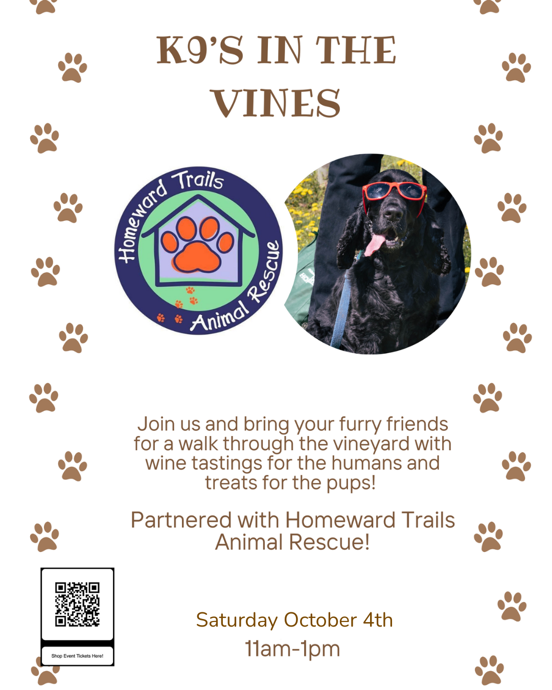 A portion of your ticket proceeds will be donated to Homeward Trails! Purchase tickets here: https://wineryatlagrange.orderport.net/product-details/1364/K9%E2%80%99s-in-the-Vines-October-2025